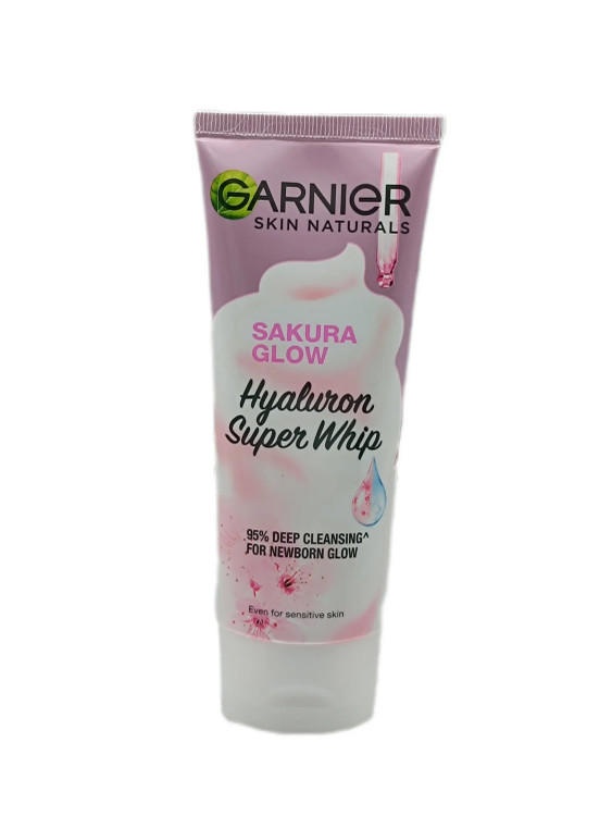 ژل شستشو عمیق برند گارنیر مدل SAKURA GLOW SUPER WHIP حاوی عصاره شکوفه وحشی گیلاس ژاپنی و عملکرد موثر در روشن کردن پوست صورت و ترمیم بافت های آسیب دیده آن دارد .